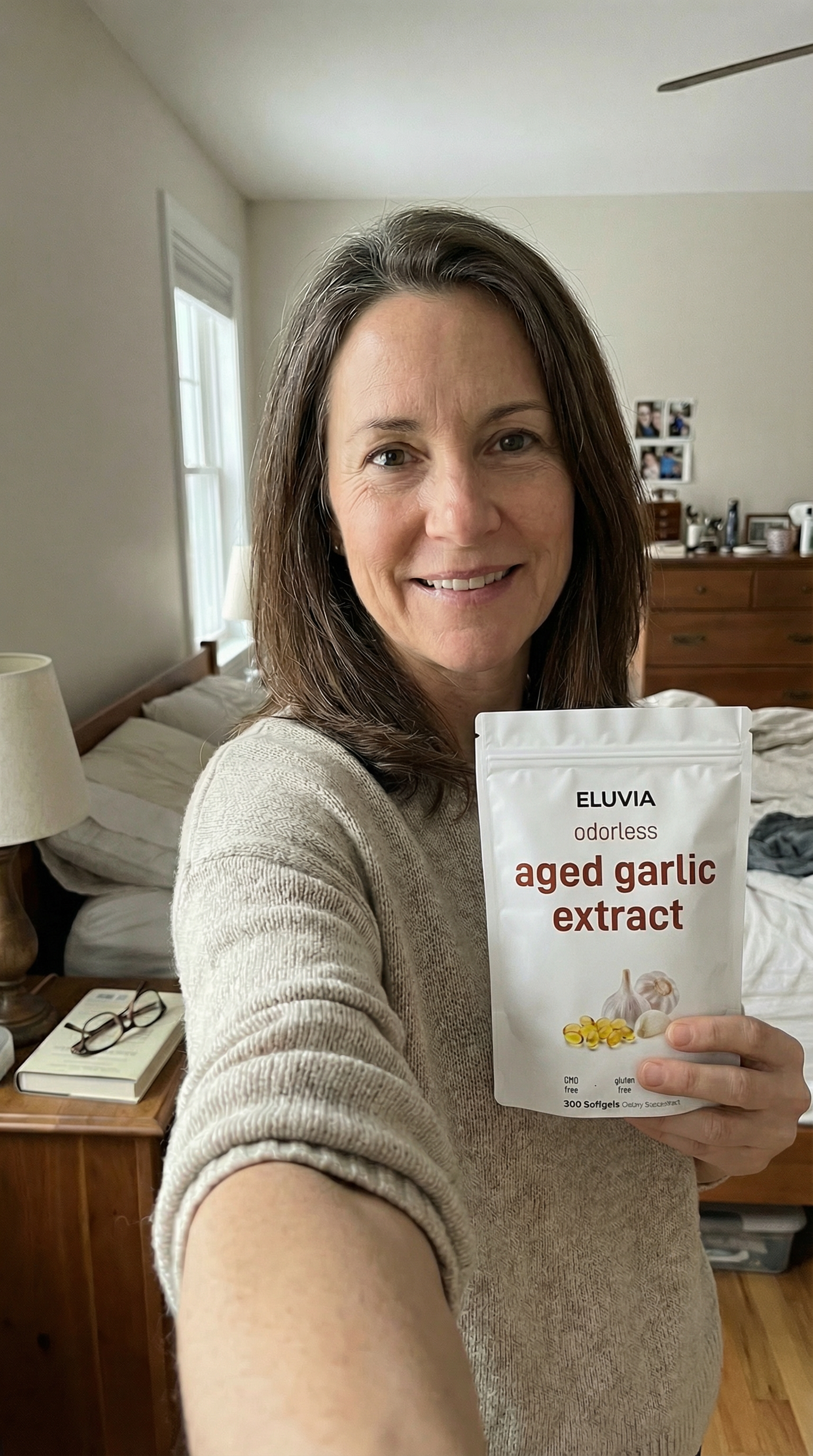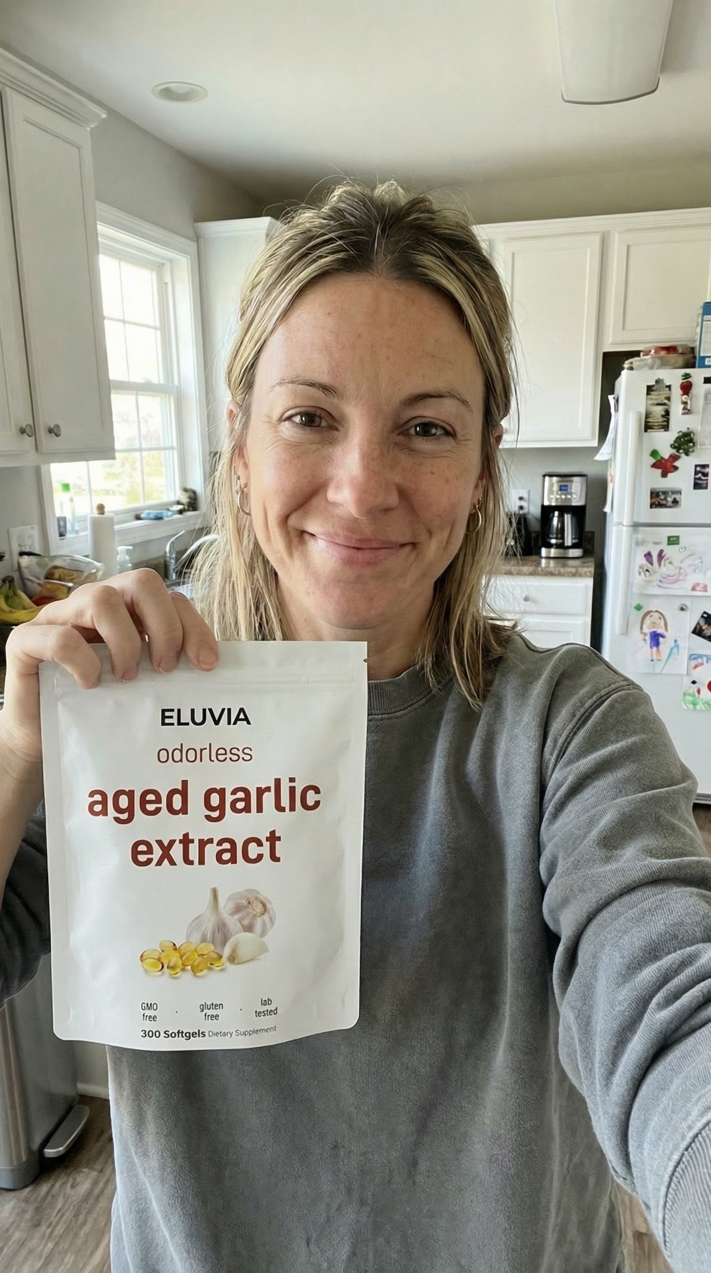"I've been taking this Eluvia aged garlic for about 5 days now, and honestly I'm impressed with how it's helping my blood pressure. Before starting this I was always worried about my numbers being too high, but I feel more confident now. The best part is it doesn't give me any garlic breath like other brands I've tried, so I have to give it a solid 5 stars. I definately recommend it."