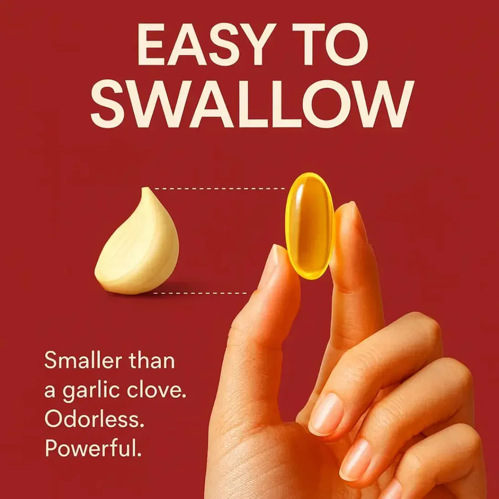 Fresh garlic and regular pills contain allicin, which is harsh on your stomach and gets destroyed by stomach acid - up to 85% is wasted. Our 24-month aging process converts these unstable compounds into bioavailable S-allyl-cysteine that's 30 times gentler and actually gets absorbed. One Elaré capsule provides the equivalent of 7500mg of aged garlic - more heart-supporting power than eating a whole bulb of raw garlic, without any digestive issues.